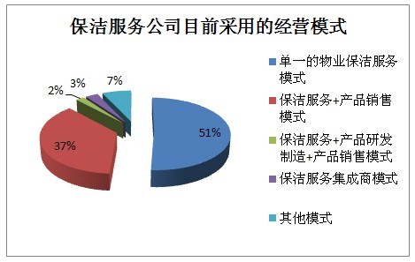 現(xiàn)階段,大部分的物業(yè)保潔公司還是采用專業(yè)化單一的保潔服務(wù)發(fā)展模式,在這物業(yè)保潔的市場里不斷發(fā)展壯大,逐漸形成了保潔服務(wù)高度專業(yè)化的競爭優(yōu)勢。調(diào)查結(jié)果顯示:單一的物業(yè)保潔服務(wù)模仍被采用的企業(yè)占51%,保潔服務(wù)+產(chǎn)品銷售的發(fā)展模式占37%,是目前物業(yè)保潔服務(wù)公司的兩大經(jīng)營模式。